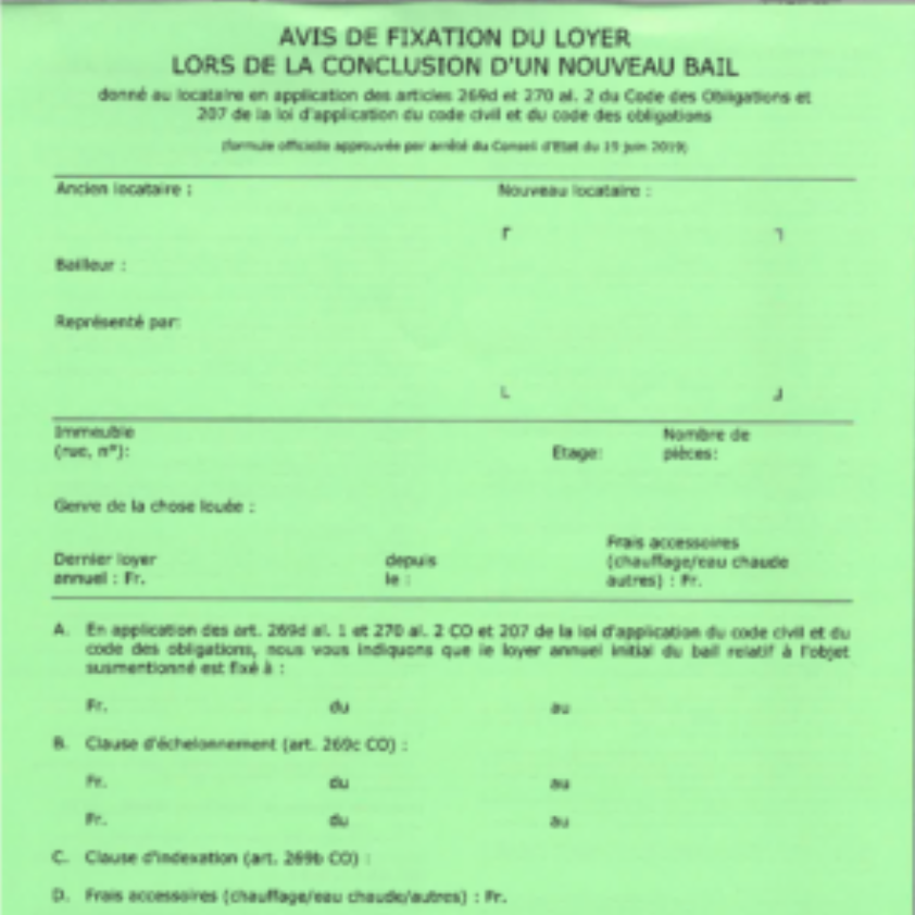 Votre bailleur ou régie doit impérativement utiliser la nouvelle formule officielle lors de toute nouvelle conclusion de bail à loyer. Ce qui change avec l'ancienne formule, c'est la mention obligatoire des critères suivants : taux hypothécaire de référence et l'indice suisse des prix à la consommation (ISPC) relative à la dernière conclusion du loyer (locataire sortant).